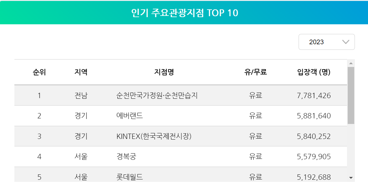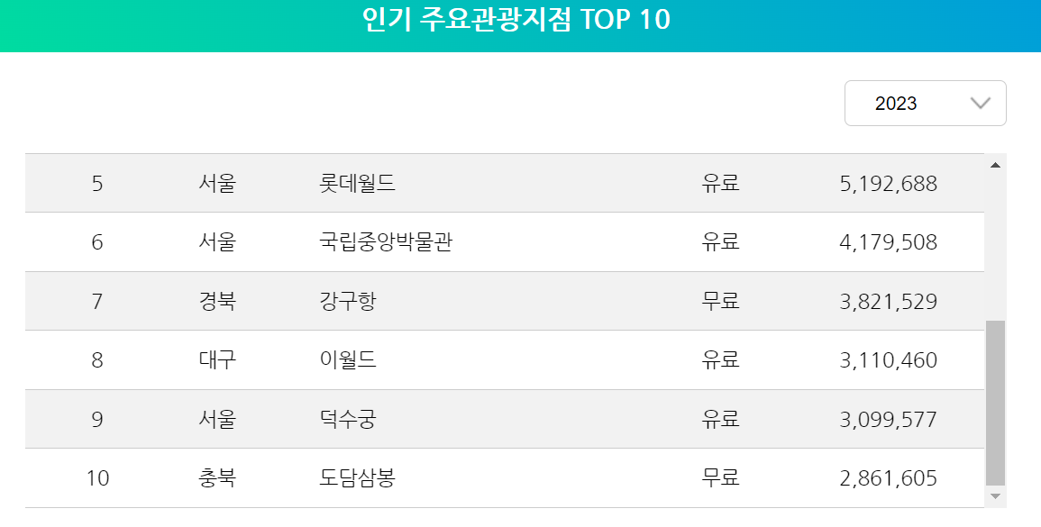 10개 관광지점 중 에버랜드, 킨텍스, 경복궁, 롯데월드, 국립중앙박물관, 덕수궁 등 6개는 서울·경기권에 있습니다. 10개 관광지점 중 7위 경북 영덕 강구항(382만명), 10위 충북 단양 도담삼봉(286만명)을 제외한 8개 지점이 유료 관광지였습니다.