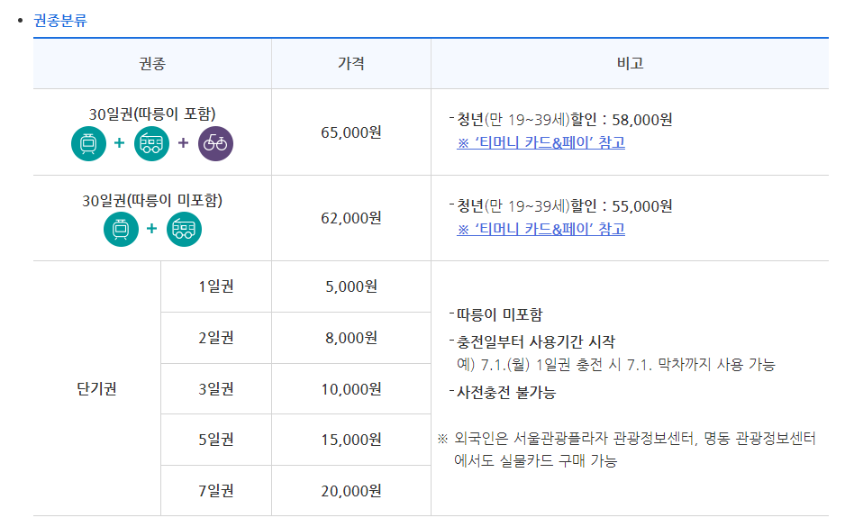 30일권은 따릉이 포함할 경우 65천원, 따릉이 미포함일 경우 62천원입니다. 청년할인일 경우 7천원이 할인됩니다.