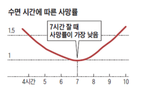 수면시간과 사망율에 대한 대표적인 것이 미국 캘리포니아대학의 크립키 교수가 100만여 명의 남녀 성인을 대상으로 평소 수면 시간과 6년간의 사망률을 추적한 연구라고 할 수 있는데요. 이에 따르면 평소 하루 7시간 잠을 잔 경우가 사망률이 가장 낮았으며, 7시간 보다 적게 잘 때와 이보다 많이 잘 때 사망률이 증가했습니다.