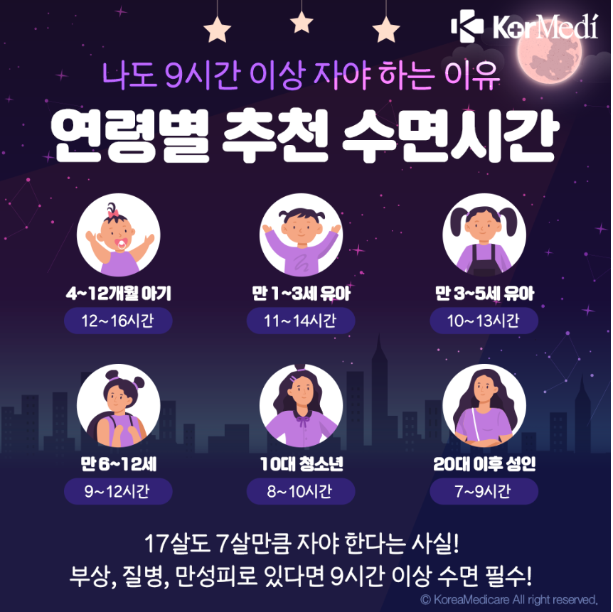 신체적, 정신적 피로 회복을 위한 적정 수면 시간은 연령에 따라 다르다고 하는데요. 국제수면학회가 권장하는 18세 이상 성인의 권장 하루 수면 시간은 7.5시간이라고 합니다. 그리고 연령에 따른 적정 수면 시간은 아래와 같습니다.