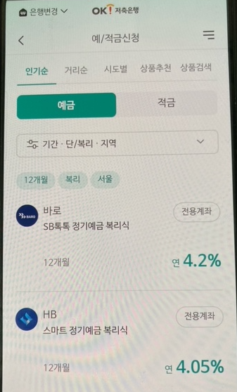 현재 SB톡톡 앱에서 가장 인기가 높은 상품인 바로 저축은행 4.2% 정기예금이 있습니다.