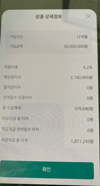 이 후 상품 정보를 확인해보시면 12개월 가입 기준으로 적용이율이 4.2%가 적용되어 5천만원 한도 가입시