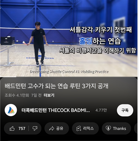 오늘 유튜브를 보는데 배드민턴 고수가 되는 연습 루틴이라는 영상이 올라왔습니다.