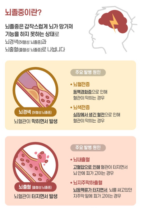뇌졸중은 갑작스럽게 뇌가 망가져 기능을 하지 못하는 상태를 말합니다. 크게 뇌경색과 뇌출혈로 나뉩니다.