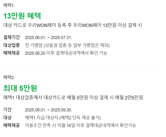 우리카드의 경우 우리WON페이 13만원 이상 결제시 13만원 혜택이 있는데요.