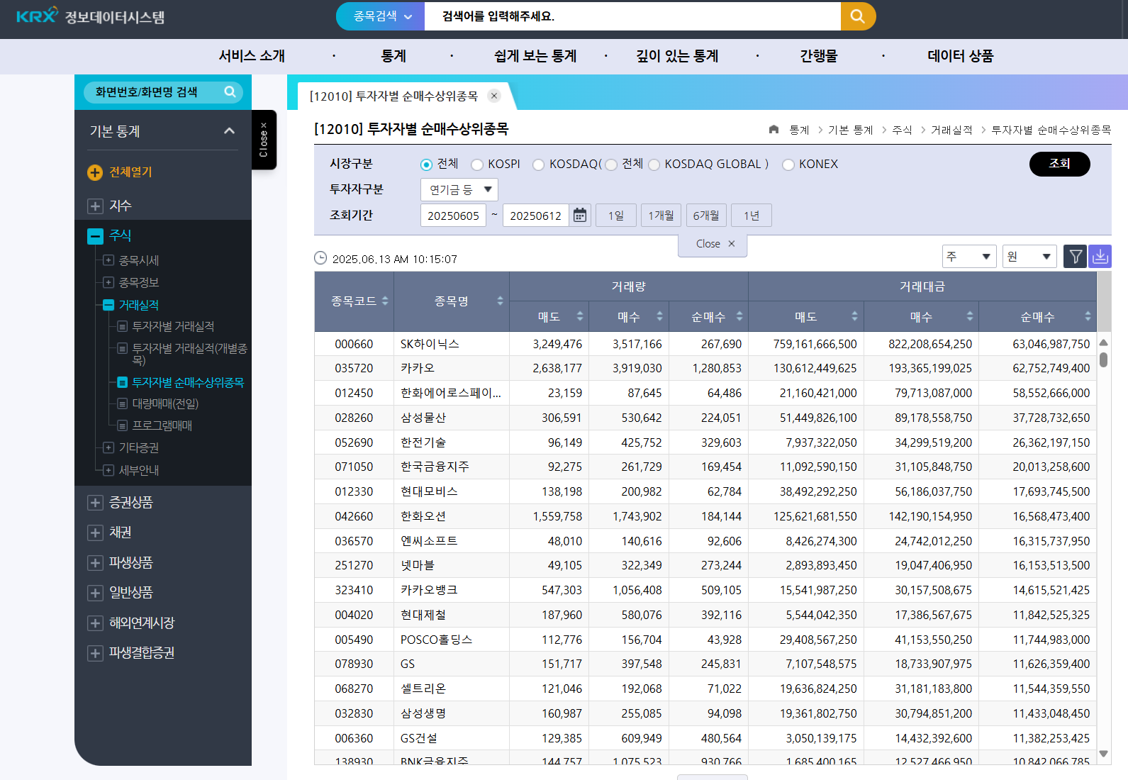 아래 통계 사이트에 접속하신 다음 투자자 구분을 연기금 등으로 변경하시면 됩니다.