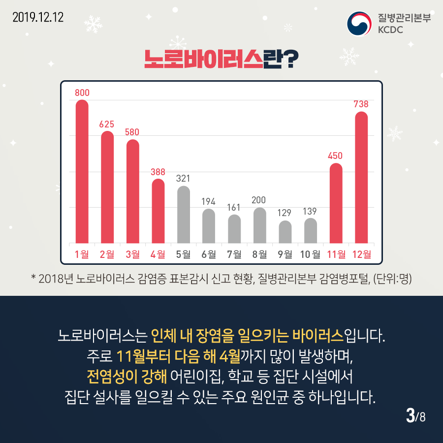 노로 바이러스의 경우 주로 겨울에 활동합니다.