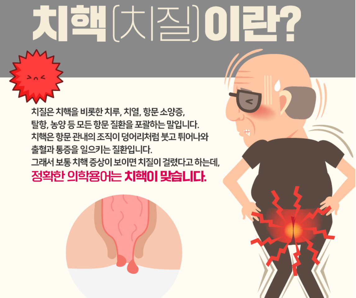 치핵은 항문 관내의 조직이 덩어리처럼 붓고 튀어나와 출혈과 통증을 일으키는 질환을 뜻합니다.