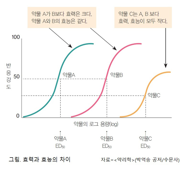 효능 : 특정한 약물을 사용하여 기대할 수 있는 최대의 반응입니다. 우리가 말하는 효과가 있다라는 뜻입니다.