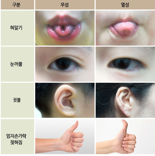 이런 유전형질에서는 우성과 열성이 있는데, 이들이 짝을 이룰 경우 우성 유전인자가 발현되며,