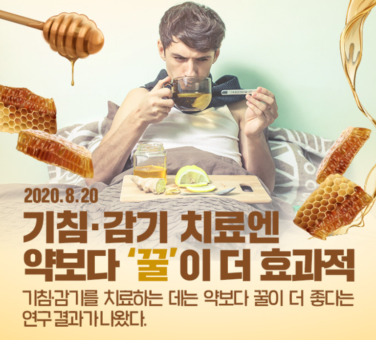 꿀에 든 항균 성분인 플라보노이드, 프로폴리스 등이 감기 증상을 낫게 하는 데 도움을 준 것으로 연구결과에 나타났는데요. 이 외에도 미국 펜실베니아주립대 의대 연구팀은 어린이 기침약 기침 억제 성분인 ‘덱스트로메토판’보다 소량의 꿀이 기침 증상과 빈도를 완화하는 데 더 효과적이라는 연구 결과를 발표한 바 있습니다.