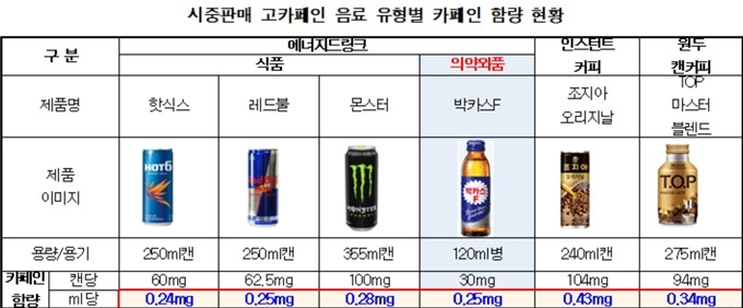 박카스에는 캔당 30mg이 들어있으며, 이는 ml당 0.25mg인 수치입니다. 핫식스, 레드불, 몬스터 역시 카페인이 들어있습니다.