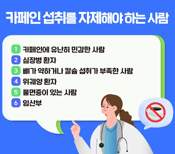 카페인에 민감하거나, 심장병환자, 뼈가 약하거나 불면증, 위궤양 환자 불면증 환자 등은 자제하는게 좋은데요.