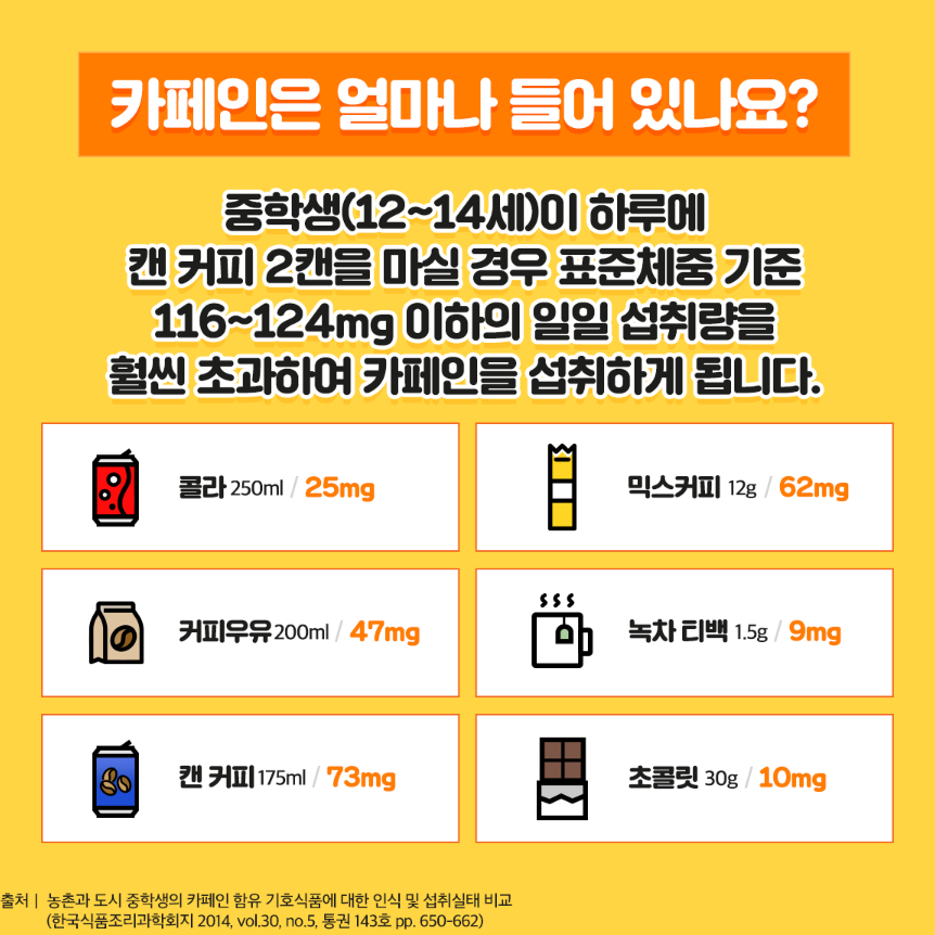 무엇보다 예방적 조치로 카페인 일일섭취 권고량을 준수할 것을 제시하였는데요. 현재 우리나라 카페인 일일 최대섭취권고량은 성인 400mg 이하, 임산부 300mg 이하, 어린이 2.5mg/kg 이하인 수치입니다. 캔커피 #~4잔 정도의 수치입니다.