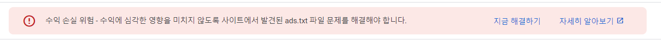 수익 손실 위험 - 수익에 심각한 영향을 미치지 않도록 사이트에서 발견된 ads.txt 파일 문제를 해결해야 합니다.
