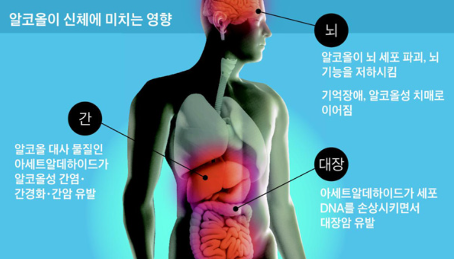 알코올은 뇌세포를 파괴하고 뇌 기능을 일시적으로 둔하게 만들어 다양한 이상 증상을 유발합니다. 뇌가 알코올에 길들여진 '중독' 수준으로 발전해, 뇌세포 파괴가 심각한 수준이 되면 기억장애나 알코올성 치매 등이 생기기도 합니다.
