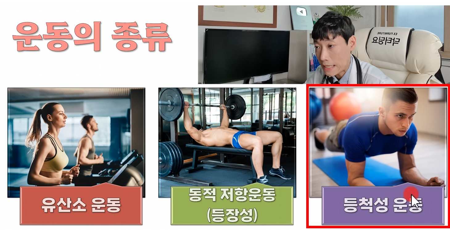 운동은 크게 유산소, 동적 저항운동, 등척성 운동 이렇게 3개로 나뉜다고 하는데요.