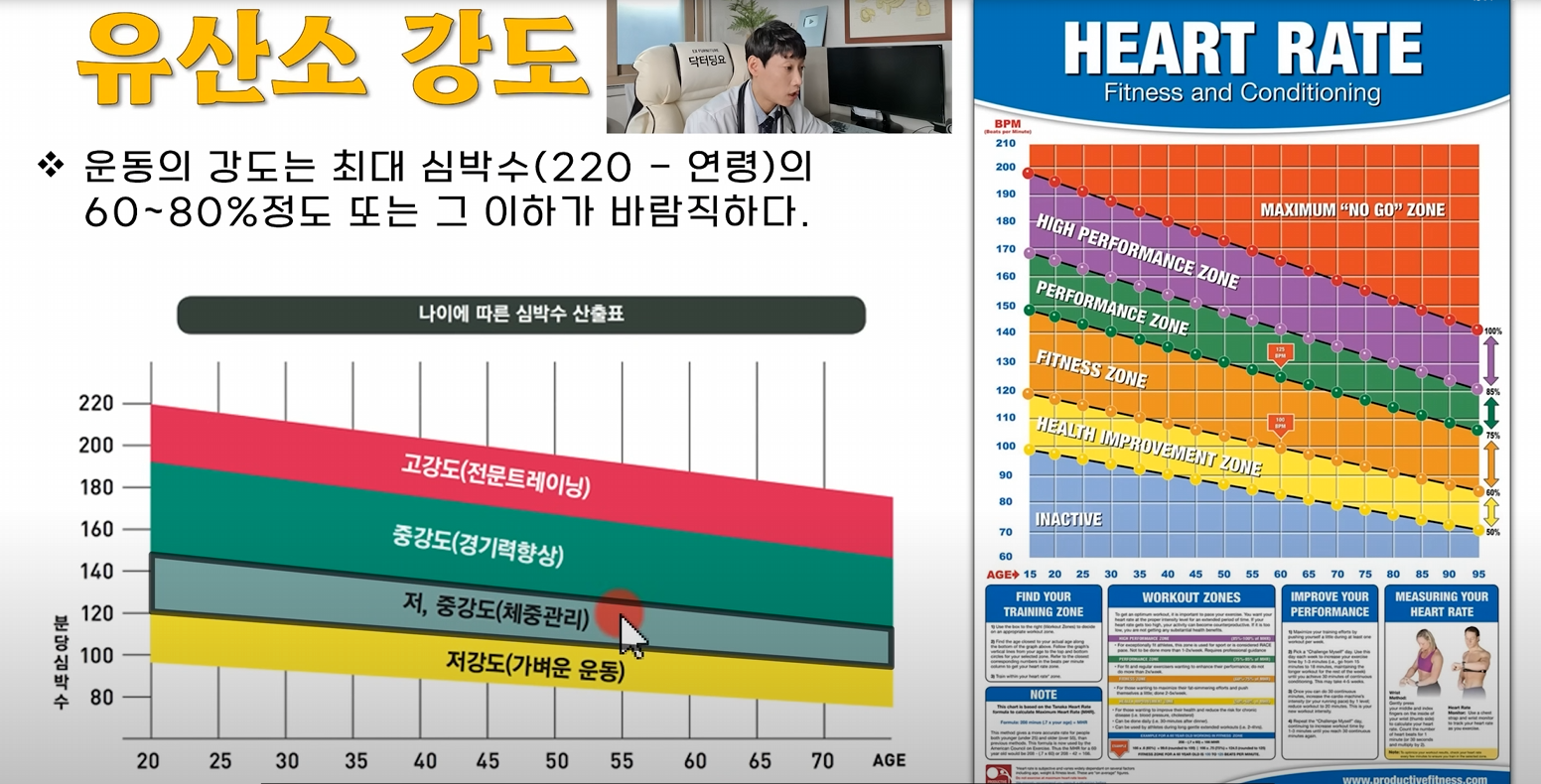 유산소를 할때는 최대 심박수의 60~80%정도가 중요하다고 합니다. 중강도로 운동하는 것이 가장 효과가 좋다고하네요.
