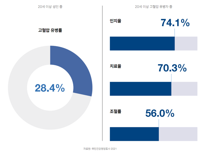 21년 국민건강영양조사를 살펴보면 현재 20세 성인 중 고혈압 유병률은 28.4%에 달합니다. 즉 성인 10명 중 3명이 고혈압이라고 할 수 있는 상황인데요.