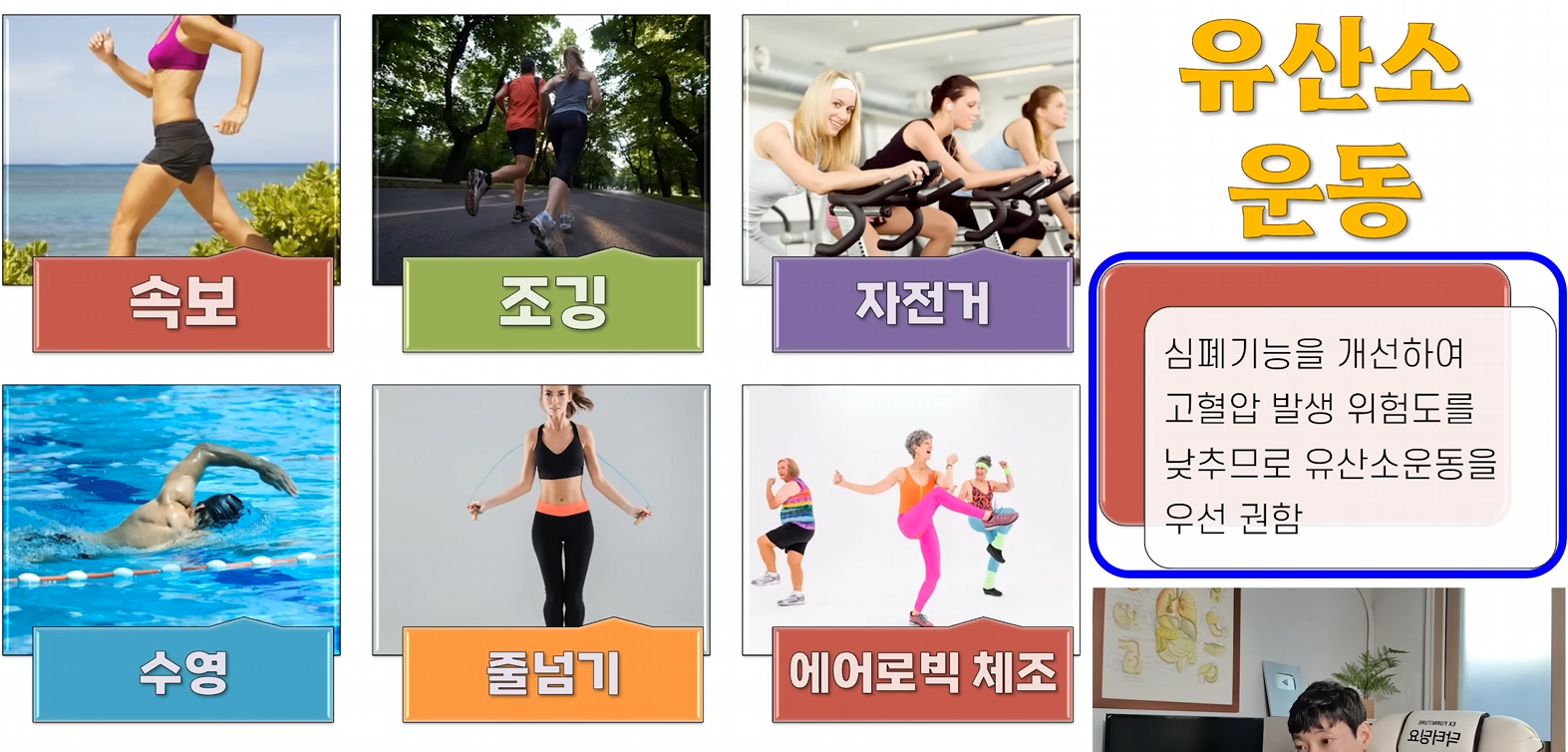 먼저 유산소 운동은 기본적으로 심폐 기능을 개선하여 고혈압 발생 위험도를 낮춰주기 때문에 가장 중요한 운동이라고 할 수 있습니다.