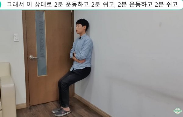 2분간 버틸 수 있도록 운동하시고 쉬고, 반복하는 패턴으로 하고 90도부터 각도를 높여서 버텨가면서 4번을 버티는 운동을 하면 된다고 합니다.